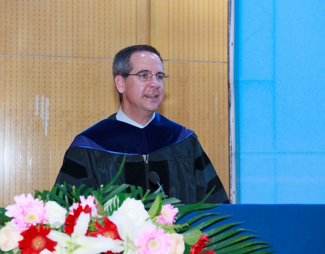 副校長孫逢春教授發表致辭,他首先向即將邁向人生新旅程的畢業生們表示熱烈的祝賀,并向專程來華參加畢業典禮的猶他州立大學嘉賓們表示誠摯的歡迎。他與在座的師生們分享了自己對于“青春”與“夢想”的看法。他叮囑同學們凡事要從小做起、從現在做起,腳踏實地、勤勤懇懇,努力用自己的雙手搭建展示夢想的舞臺。同學們離開校園之后,或早或晚都將融入社會的熔爐,面對充滿未知的世界,他鼓勵同學們只要堅持,希望就在眼前。最后,他期待同學們走出校園之后能取得更大的成功,并希望同學們能夠繼續關心母校的建設和發展,?;丶铱纯?。