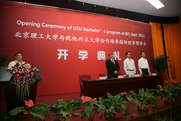 9月9日下午,北京理工大學與美國猶他州立大學合作辦學項目2011級新生開學典禮在校中心教學樓一層報告廳隆重舉行。參加開學典禮的有北京理工大學副校長孫逢春教授、猶他州立大學Jon Huntsman商學院經濟與金融系中國學術項目主任Dwight Israelsen教授、我校國際教育合作學院院長梅文博教授、副院長李小平教授、教師代表、項目管理老師以及全體新生。典禮由李小平副院長主持。