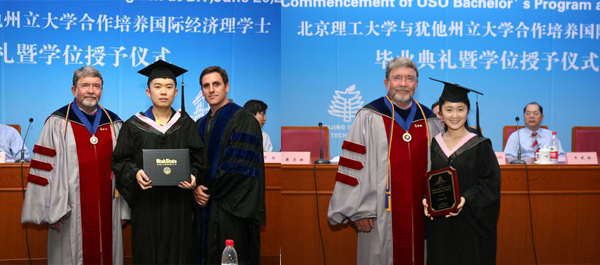 明道福副院長(zhǎng)首先宣讀了獲得猶他州立大學(xué)學(xué)士學(xué)位學(xué)生名單,猶他州立大學(xué)商學(xué)院副院長(zhǎng)Frank Caliendo博士給全體畢業(yè)生一一頒發(fā)了猶他州立大學(xué)學(xué)士學(xué)位證書并合影留念。Dwight Israelsen教授代表猶他州立大學(xué)商學(xué)院授予高雅同學(xué)2013年度杰出畢業(yè)生稱號(hào),并頒發(fā)杰出畢業(yè)生獎(jiǎng)牌。