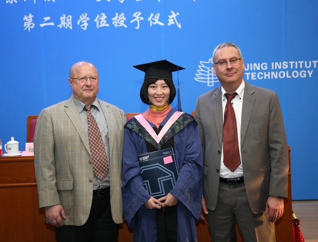 2014年3月8日下午,北京理工大學與德國德累斯頓工業大學合作培養職業教育碩士項目第二期學位授予儀式在我校國際教育交流大廈三層報告廳隆重舉行。出席儀式的有我校副校長孫逢春教授,德累斯頓工業大學職業教育與人力資源開發碩士專業考試委員會主席Hanno Hortsch 教授、Steffen Kersten博士,我校國際交流處處長王慶林教授、國際教育學院院長梅文博教授、蔣志湘副院長。國際教育學院部分教職工、全體畢業生及部分學生家屬一起參加了學位授予儀式。授予儀式由梅文博院長主持。