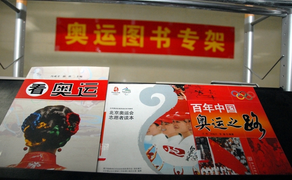 “奧運(yùn)圖書專架”的圖書涉及奧運(yùn)知識、奧運(yùn)禮儀、奧運(yùn)英語、奧運(yùn)人物、奧運(yùn)競賽規(guī)則、奧運(yùn)志愿者讀本等類別。