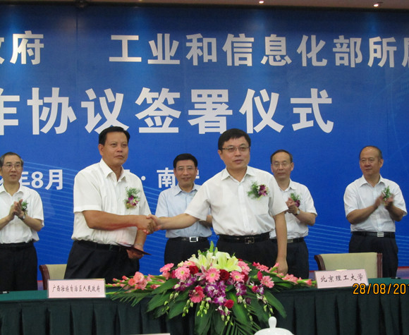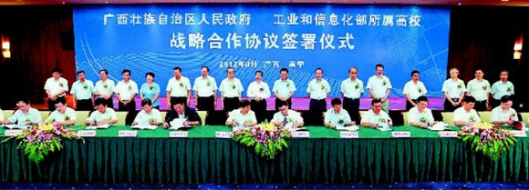 2012年8月28日,廣西壯族自治區人民政府—工業和信息化部所屬高校戰略合作協議簽署儀式在廣西南寧舉行。廣西壯族自治區黨委書記郭聲琨等出席活動,工業和信息化部部長苗圩、廣西壯族自治區人民政府主席馬飚致辭,并共同見證簽署儀式。