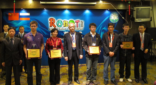 在機器人表演中,我校新型節肢機器人以其精彩絕倫的表演技壓群雄,獲得了"最佳團隊獎"。該機器人具有四十多個電機,能順利完成幾十種步態的運動,其多電機協調控制技術體現了我校大學生先進的電機控制水平,在國際上也屬佼佼者。新型節肢機器人的表演在現場引起轟動反響,受到眾多高校及國際友人的關注,賽后俄羅斯薩瑪拉國立航空航天大學、新西伯利亞國立技術大學、圣彼得堡信息科學o機械與光學大學的師生們紛紛前來與我方進行交流。