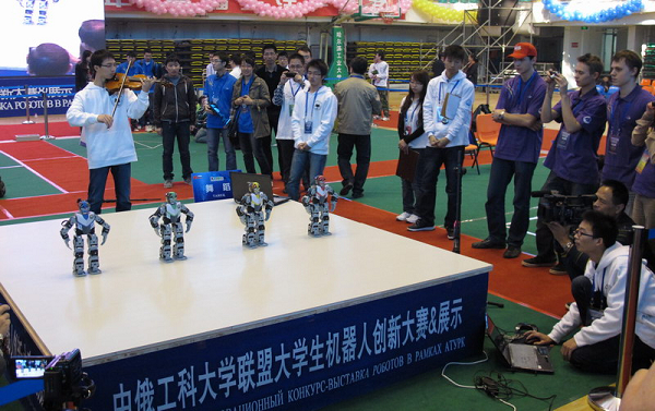 10月12日上午11點,精彩紛呈的機器人多人舞拉開帷幕,我校機器人多人舞表演的主題為《和》,小提琴現場演奏為機器人舞蹈配樂,體現了人機之和;中俄兩國特色舞曲的混編,演繹了國際之和;各大高校機器人的同臺競技,展現了校際之和。如此獨具特色的表演編排,在眾多參賽隊的舞蹈中獨樹一幟,點燃了現場媒體及國際友人的熱情之火,得到了其他參賽隊員和現場觀眾的高度贊揚,并取得了此項目第三名的佳績。