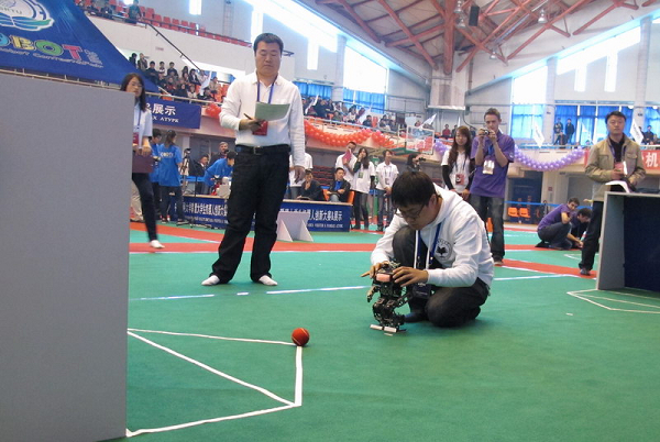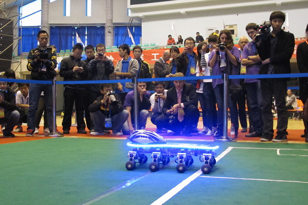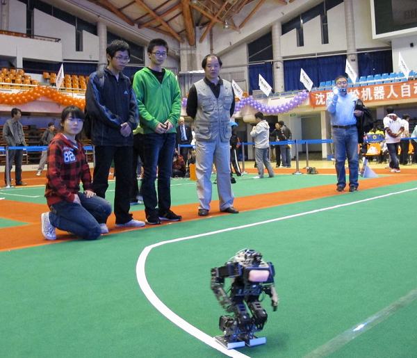 在機器人點球項目中,我校參賽機器人以高超的視覺技術為后盾,眼明腳準,取得了六射四中的好成績,獲得了此項比賽第二名,其極高的精準度得到眾多觀眾的熱烈喝彩。