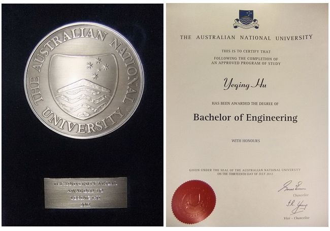 澳大利亞國立大學獎章是一項極高的榮譽,僅授予當年畢業(yè)生中極少數(shù)的佼佼者,每次獲此殊榮者一般全校不足10人。獲此殊榮的學生必須獲得一等榮譽學士,并且在同屆畢業(yè)生中取得突出學術成績。今年7月,澳大利亞國立大學工學院僅有胡野青和郭婧兩名同學獲得該項榮譽。