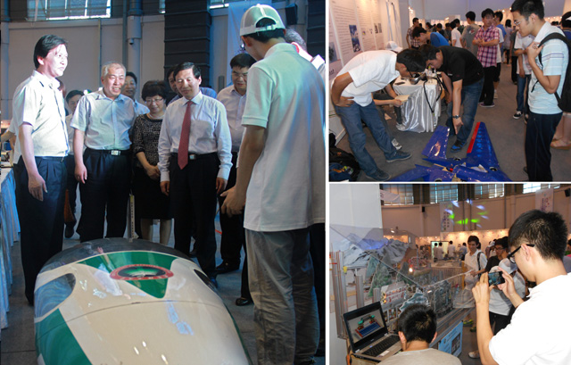 我校為參加此次成果展示與交流會進行了精心的準備工作,選送了“長征組歌”、“節能概念車”、“大視場普及型頭盔顯示器”、“墊升式起降技術驗證機”、“基于物聯網的超市快速結算系統”等大學生科研創新成果參加了展覽,這些作品在展會上吸引了眾多師生的目光,受到與會領導的高度關注。
