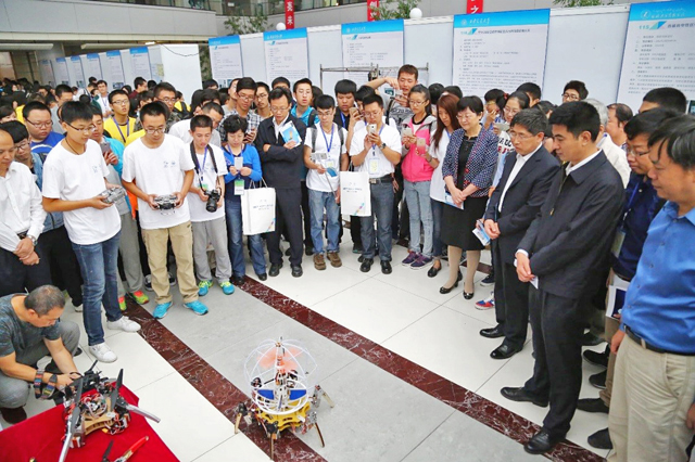 在精彩紛呈、競爭激烈的展示中,北京理工大學(xué)兩項(xiàng)參展作品——“‘飛天靈蛛’機(jī)器人”和“新型鼠籠式陸空兩棲無人機(jī)”得到了與會(huì)者的高度關(guān)注。這兩件機(jī)器人實(shí)物作品外形炫酷、功能強(qiáng)勁、性能卓異、演示精彩,得到了與會(huì)專家和學(xué)生的高度評(píng)價(jià),在年會(huì)現(xiàn)場產(chǎn)生了極大的轟動(dòng)。