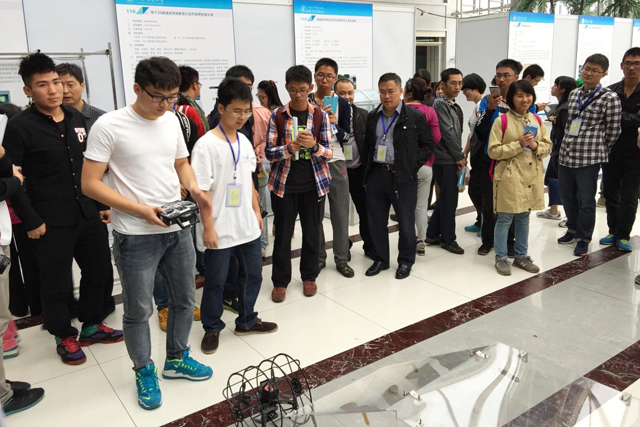 “鼠籠式無人機(jī)”在展會(huì)當(dāng)天受到了來自國內(nèi)外參會(huì)人員的肯定和支持。該作品由自動(dòng)化學(xué)院學(xué)生自主研發(fā),是國內(nèi)首次將外部鼠籠框架與內(nèi)部四軸八旋翼結(jié)構(gòu)相結(jié)合的新型陸空兩棲無人機(jī)。作品主要應(yīng)用于管道、山洞等復(fù)雜狹小空間的探測活動(dòng),在軍事和民用領(lǐng)域均有一定的推廣價(jià)值和廣泛的應(yīng)用前景。
