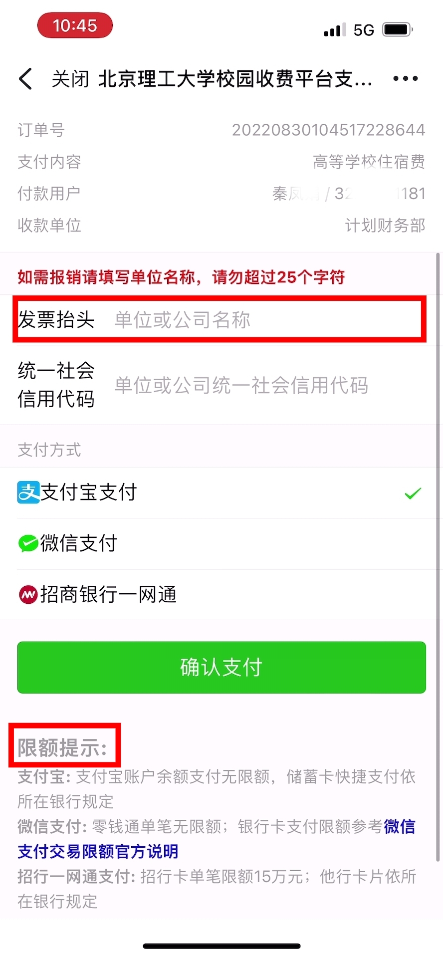 根據財政部要求,學生繳費開具的票據“交款人”應是學生本人姓名。如需在姓名后增加單位、公司名稱的,請在支付訂單中發票抬頭處填寫名稱。