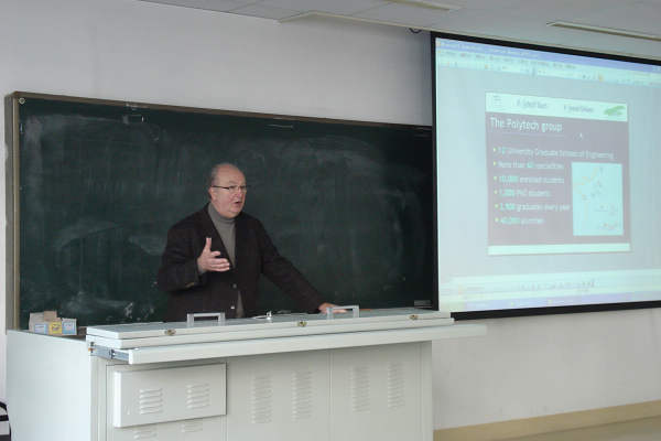 2009年11月17日下午2:00在信息樓3010教室,學校教務處組織召開了“法國工程師教育體系及法國大學圖爾工程師學院項目”講座,由來自法國的GuyREGNIER先生主講。GuyREGNIER先生是法國國家教育部、法國科學院、歐盟及國際事務合作部秘書長,PolytechGroup法國圖爾大學工程師學院國際交流項目代表。