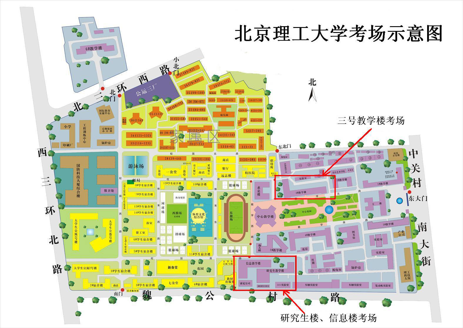 報考北京理工大學的考生在研究生教學樓(考生編號后五位范圍:00001-01811,02534-02862,03337-03357)、信息教學樓(考生編號后五位范圍:01812-02533,02863-03336,03358-04574)和三號教學樓考試(考生編號后五位范圍:04575-04859),報考外埠招生單位(含北京市各研究所)的考生在三號教學樓考試。