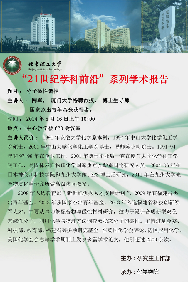 ?>?化學學院“21世紀學科前沿”陶軍教授學術報告預告
