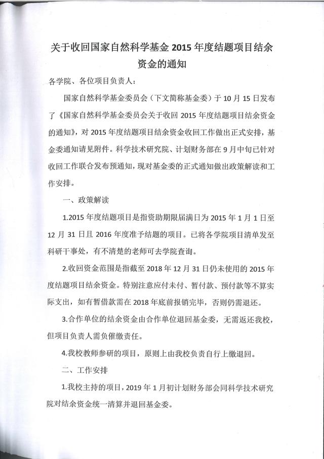 ?>?關于收回國家自然科學基金2015年度結題項目結余資金的通知
