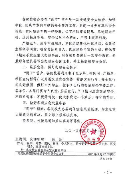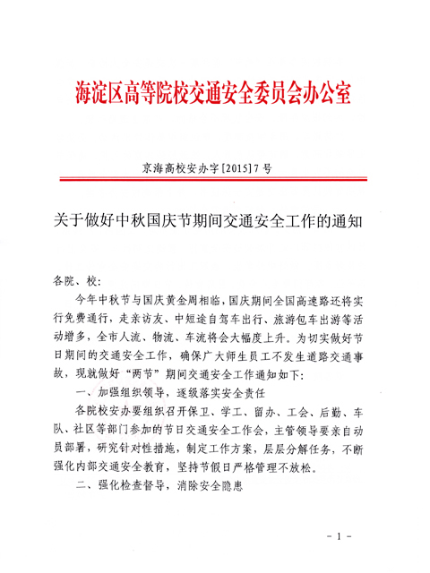 根據海淀區高等院校交通安全委員會辦公室《關于做好中秋國慶節期間交通安全工作的通知》(詳見附件)要求,為切實做好節日期間的交通安全工作,確保廣大師生員工及家屬區居民不發生道路安全事故,請各學院、部、處在“兩節”期間做好以下工作: