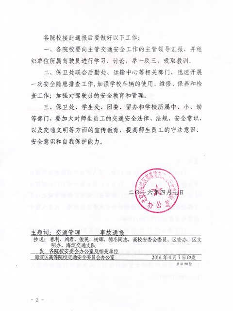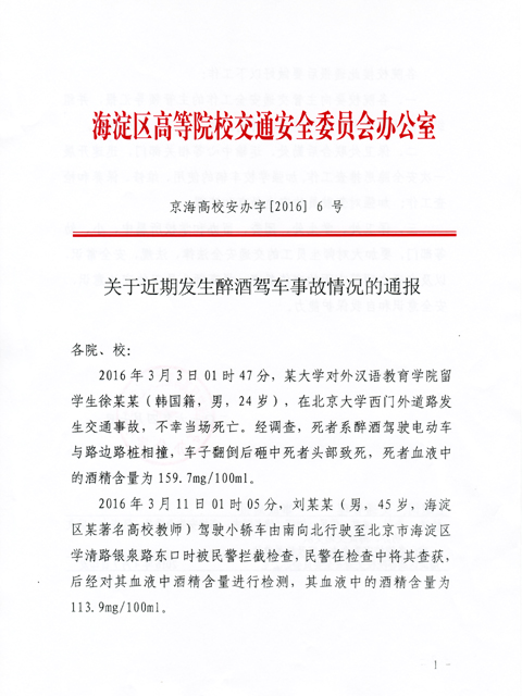 為預防和減少因酒駕導致的道路交通事故,現轉發海淀區高等院校交通安全委員會辦公室《關于近期發生醉酒駕車事故情況的通報》(京海高校辦字[2016]6號),請各學院、部、處組織所屬師生員工、駕駛員做好以下工作: