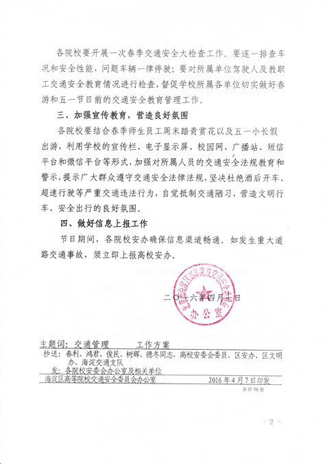 根據海淀區高等院校交通安全委員會辦公室《關于做好“五一”期間交通安全工作的通知》(詳見附件)要求,為切實做好“五一”期間的交通安全工作,確保廣大師生員工假期的交通安全,請各學院、部、處做好以下工作: