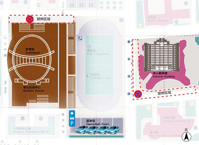(1)本周四(9月13日)零點至周日(9月16日)24時,中心教學樓西側停車場、南側沿路禁止停車。