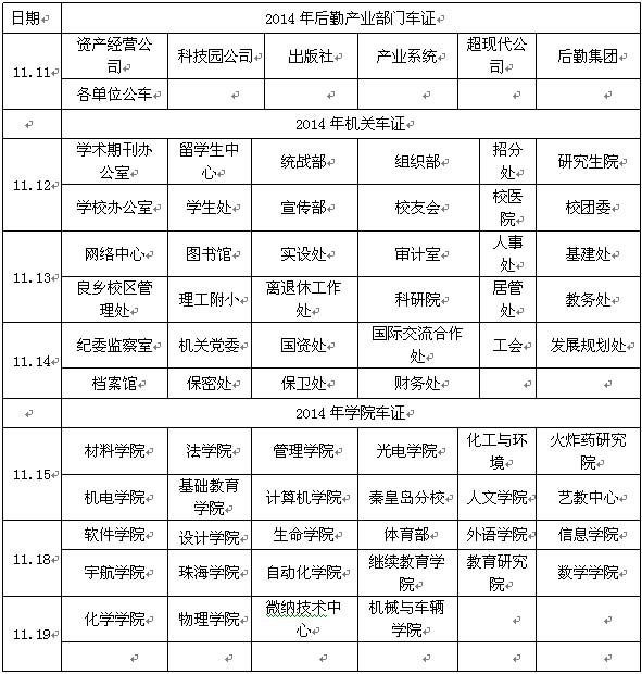 3. 自11月11日起,各單位到停車公司(菜市場北門對面)進行交費并領取2014年停車證。各單位領取車證時間安排如下: