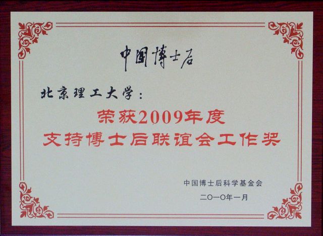 2010年1月8日,2010年北京博士后迎春晚會在友誼賓館貴賓樓多功能廳舉行,會上對部分博士后設站單位進行了表彰。我校積極參與和支持博士后聯誼會的工作,榮獲由中國博士后科學基金會頒發的“2009年度支持博士后聯誼會工作獎”。