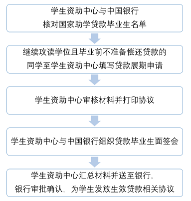 已辦理校園地國家助學貸款的同學如需繼續(xù)攻讀學位,并且畢業(yè)前不準備償還貸款,可申請辦理貸款展期,貸款展期即將現(xiàn)有貸款辦理延期申請,變更還款期限,在繼續(xù)攻讀學位期間貸款利息由國家補貼無需個人承擔,待繼續(xù)攻讀學位完成后開始還款。具體辦理流程如下: