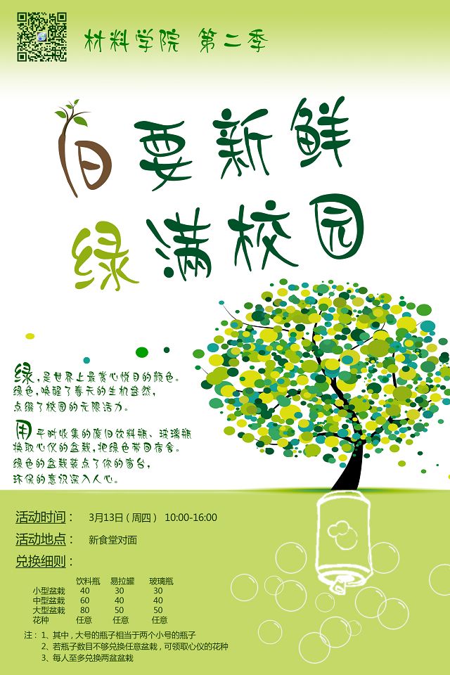 正值植樹節,材料學院第二季“舊要新鮮 綠滿校園”環保公益活動如期而至。用平時收集的廢舊瓶子,換取生機盎然的盆栽,綠色環保一舉兩得。