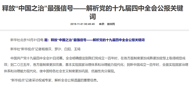釋放“中國之治”最強信號——解析黨的十九屆四中全會公報關鍵詞