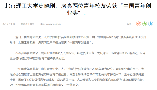 北京理工大學史曉剛、房亮兩位青年校友榮獲“中國青年創業獎”