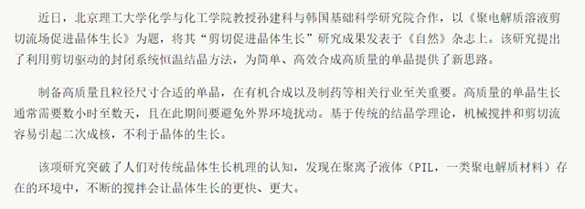 該項研究突破了人們對傳統晶體生長機理的認知,發現在聚離子液體(PIL,一類聚電解質材料)存在的環境中,不斷的攪拌會讓晶體生長的更快、更大。
