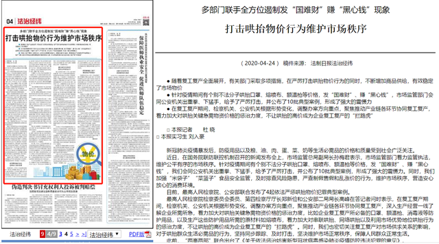 最高人民檢察院檢察委員會委員、第四檢察廳廳長鄭新儉和公安部二局局長高峰在答記者問時表示,在復工復產期間,檢察機關、公安機關根據形勢變化,調整辦案方向重點,聚焦推動產業鏈各環節協同復工復產,深入生產經營一線了解企業所需所急,著力加大對哄抬關鍵急需物資價格的懲治力度,比如企業復工復產所必備的口罩、額溫槍、消毒液等防護用品,以及生產這些防護用品所需的原材料如熔噴布,著力加大對串聯哄抬、網絡哄抬以及利用市場優勢地位哄抬行為的懲治力度,不讓哄抬的高價成為企業復工復產的“攔路虎”。同時,我們也密切關注復工復產對市場供求關系的影響,對于哄抬群眾生活必需品的行為,堅持同步跟蹤、及時打擊,堅決維護市場正常秩序,保障人民群眾正常生活。