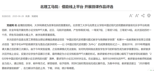疫情防控期間,大學網(wǎng)課成為改革創(chuàng)新的重要契機。北京理工大學馬克思主義學院中國近現(xiàn)代史綱要教研室依托樂學平臺和微信群,在全年級開展優(yōu)秀小論文和PPT大賽。近日,馬院評選揭曉,產(chǎn)生特等獎3組、一等獎7組、二等獎12組、三等獎14組。此次活動歷時一個月,師生互動頻率大幅上升,教學效果顯著提高。