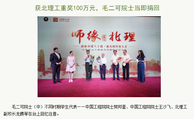 獲北理工重獎100萬元,毛二可院士當(dāng)即捐回