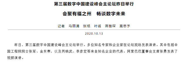 昨日,第三屆數字中國建設峰會主論壇舉行。多位知名專家和企業家在論壇現場發表演講。其中包括中國工程院院士張軍、金東寒,以及芮曉武、李彥宏等來自知名企業的代表。阿里巴巴董事會主席張勇發表了視頻演講。