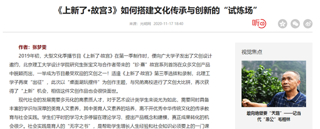 《上新了·故宮》這樣的節(jié)目,凸顯了社會(huì)實(shí)踐育人與高校人才培養(yǎng)的融合,節(jié)目所提供的廣闊舞臺(tái)和資源支撐,讓學(xué)生將理論知識(shí)轉(zhuǎn)化為實(shí)際應(yīng)用,不但讓學(xué)生個(gè)人設(shè)計(jì)水平得到了充足試煉,更是推動(dòng)了廣大學(xué)生參與設(shè)計(jì)實(shí)踐的熱情,是個(gè)非常有利于學(xué)生成長(zhǎng)成才的創(chuàng)意嘗試,為學(xué)生走向社會(huì)架起一座橋梁。