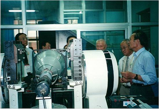 1995年211工程驗收期間,祁載康(右一)向專家介紹實驗室建設情況