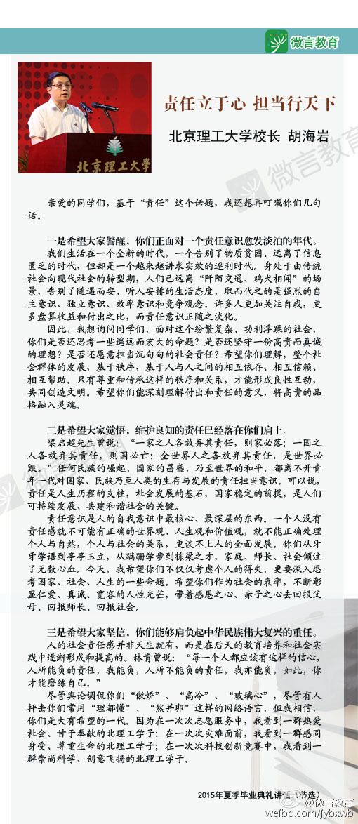 【編者按】6月29日學(xué)校2015屆本科生畢業(yè)典禮暨學(xué)位授予儀式上,北理工校長胡海巖院士作了題為《責(zé)任立于心,擔(dān)當(dāng)行天下》的致辭,人民網(wǎng)、光明日報、教育部微言教育等多家主流媒體轉(zhuǎn)載或轉(zhuǎn)發(fā)。校長致辭不僅是對畢業(yè)生的臨別贈言,也代表了一所大學(xué)對全體學(xué)子在人格品行、學(xué)養(yǎng)修為上的殷殷期盼,亦是對我校校訓(xùn)“德以明理 學(xué)以精工”的生動解讀。宣傳部對相關(guān)報道進行搜集整理,希望引發(fā)全體師生員工學(xué)習(xí)思考。