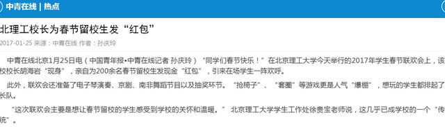 這是北京理工大學大二學生劉寒冰第一次留校過春節。來自云南省昭通市威信縣的他,回趟家約需40個小時,“太遠了所以決定留校,并想趁寒假多做些兼職和實習。” 這次能收到校長親自發的“紅包”,劉寒冰很意外也很開心。