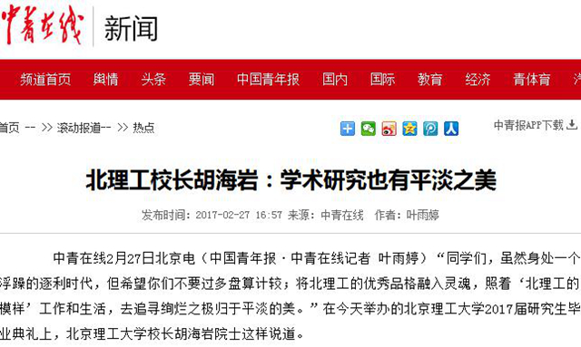 【中青在線】北理工校長胡海巖:學術研究也有平淡之美