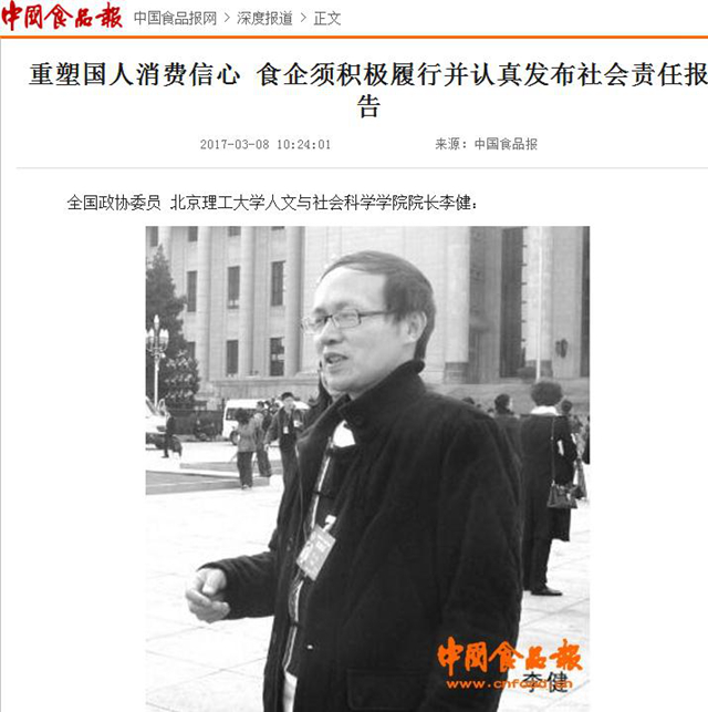 【中國食品報】李健委員:重塑國人消費信心 食企須積極履行并認(rèn)真發(fā)布社會責(zé)任報告