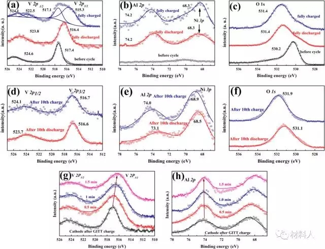 (g)經恒電流滴定后的正極材料經氬離子槍刻蝕不同時間后的V2p