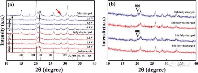 (b)第5周和第10周完全充放電的正極極片XRD