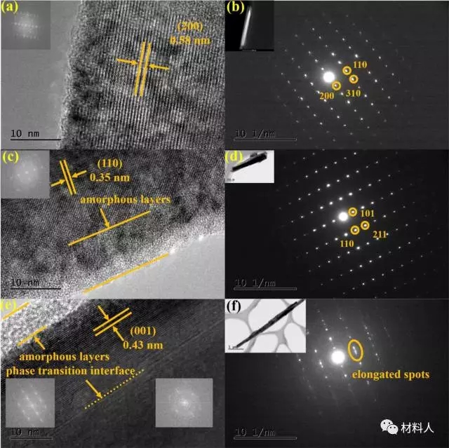 (e)首周充電后納米線的高分辨透射電鏡圖