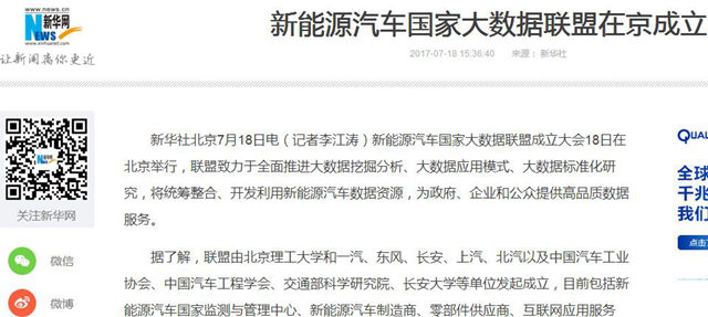 【中國新聞網】新能源汽車國家大數據聯盟成立