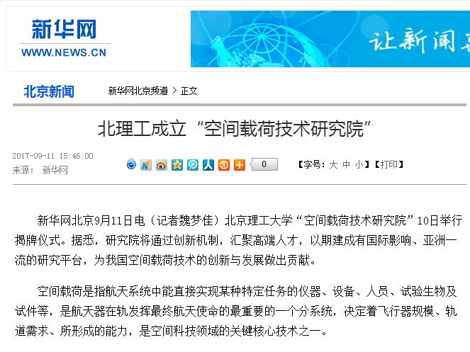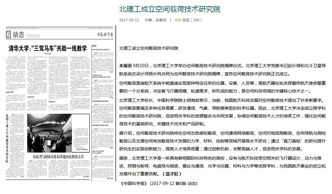 【人民網】北理工成立跨學科空間載荷技術研究院