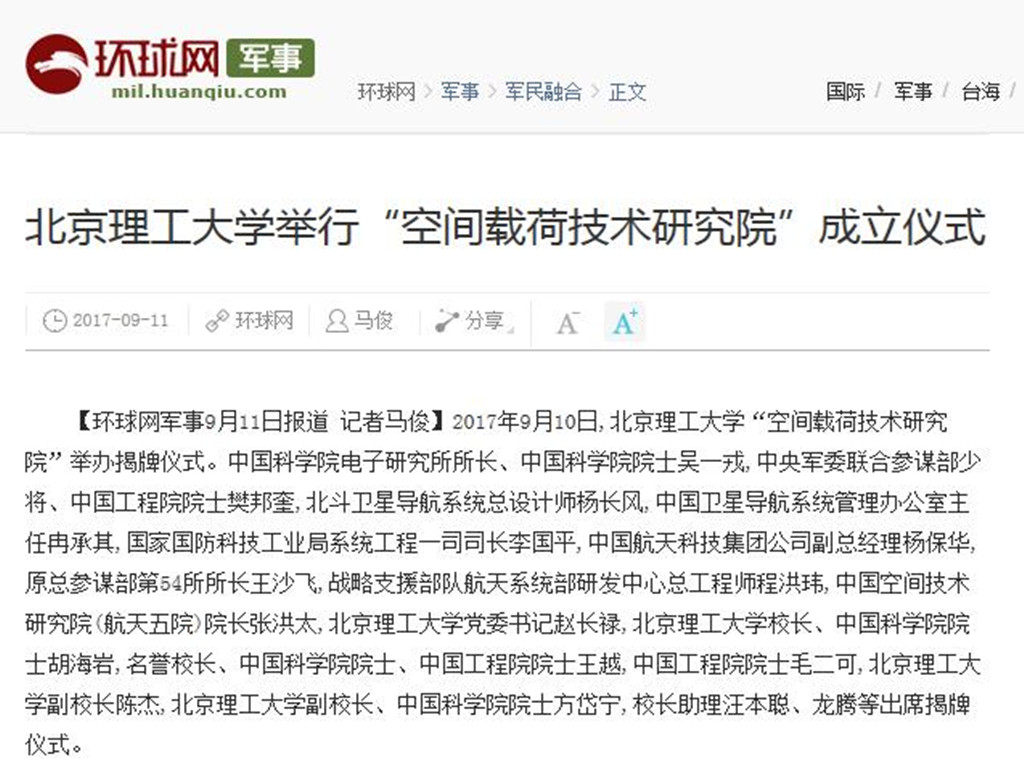 【環球網】北京理工大學舉行“空間載荷技術研究院”成立儀式