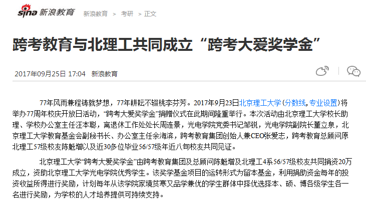 【新浪教育】跨考教育與北理工共同成立“跨考大愛獎學金”