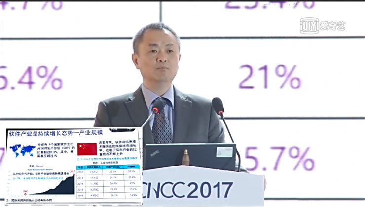 大會第一環節是特邀報告,中科院院士,北京理工大學副校長梅宏教授作為大會開幕式后的第二位出場嘉賓帶來了題目為《軟件定義一切——機遇和挑戰》的現場報告。