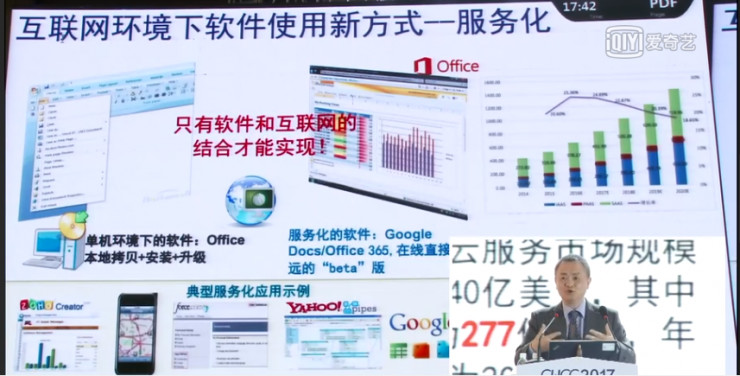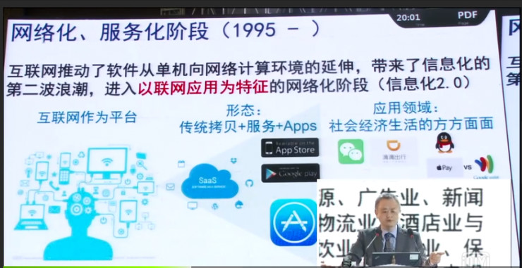 我想講一講這三個階段的大體特征。在軟硬一體化階段,也就是計算機剛出現的時候,是沒有軟件的,都是以程序實現的,大體上展現方式的是機器語言,匯編語言。早期應用領域以破解密碼,軍事領域的計算為主。60年代初期,開始出現“軟件”一詞,融合程序和文檔為一體,作為獨立的形態從硬件分離出來,以IBM 360系列機為代表(盡管還是和硬件捆版一起銷售),也逐漸形成了計算機學科和程序員行業。它的展性形式是高級程序語言+文檔,應用領域主要是商業計算和其他科學計算領域。軟件產品化、產業化階段,以Microsoft和Oracle的出現,標志著軟件開始成為一個獨立產業。PC的廣泛應用和軟件產品化催生了人類歷史上信息化的第一波浪潮,其主要特征即以單機應用為特征的數字化階段。緊接著就出現了辦公軟件,徹底改變了人類傳統的辦公行為,微軟office迄今依然是微軟標志性產品之一。九十年代中期開始 ,軟件進入網絡化,服務化階段。互聯網推動了軟件從單機向網絡計算環境的延伸,帶來了信息化的第二波浪潮 ,其基本特征是以聯網應用為特征的網絡化階段。