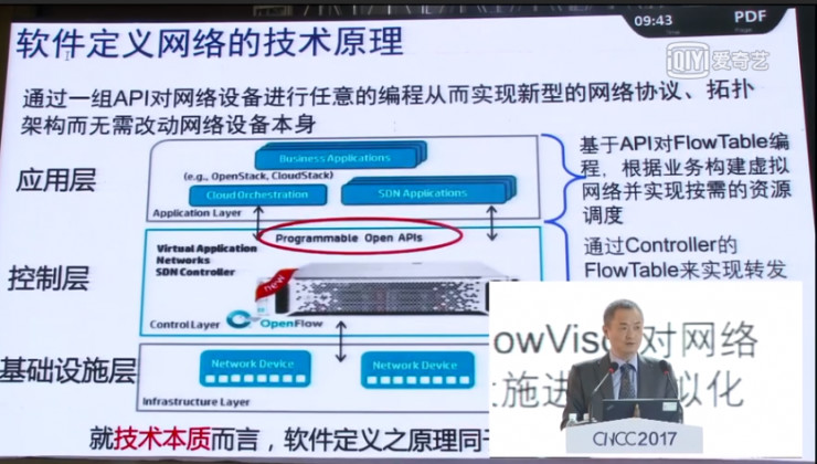 第二部分我講的是軟件定義的時代。互聯網及其延伸,正在導向我們走在一個新的模式,人-機-物的融合。信息技術的網絡化、泛在化、智能化趨勢蘊含了人-機-物和諧發展的愿景。當前,正在興起信息化的第三波浪潮,即以數據的深度挖掘與融合應用為特征的智慧化階段。這個階段我命名為智能化階段,在這個新的環境下,人機物融合環境下的信息基礎設施是海量的資源。第二來看他的應用,人機物融合環境下的新型應用:需求形態多樣。面對海量資源和應用需求形態多樣的這兩個特征,人機物融合需要新的平臺環境,如何凝練應用共性,如何有效管理資源這是這個平臺的基本要求。在這樣的平臺之下,由于應用需求變化頻繁和應用場景動態多變,這個平臺能否實現按需靈活定制?