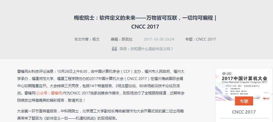 雷鋒網AI科技評論消息:10月26日上午8:30,由中國計算機學會(CCF)主辦,福州市人民政府、福州大學承辦,福建師范大學、福建工程學院協辦的2017中國計算機大會(CNCC 2017)在福州海峽國際會展中心如期隆重召開。大會持續三天兩夜,包括14個特邀報告、2場主題論壇、80余場前沿技術論壇及活動。雷鋒網作為CNCC 2017獨家戰略合作媒體,到現場進行了全程跟蹤報道,近期將會陸續放出特邀嘉賓的精彩報告,敬請關注!